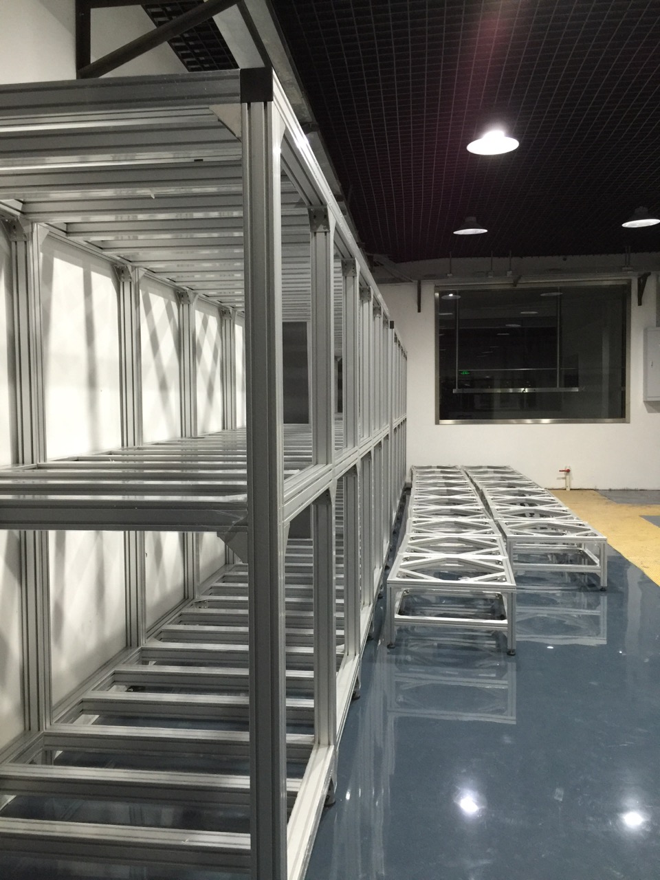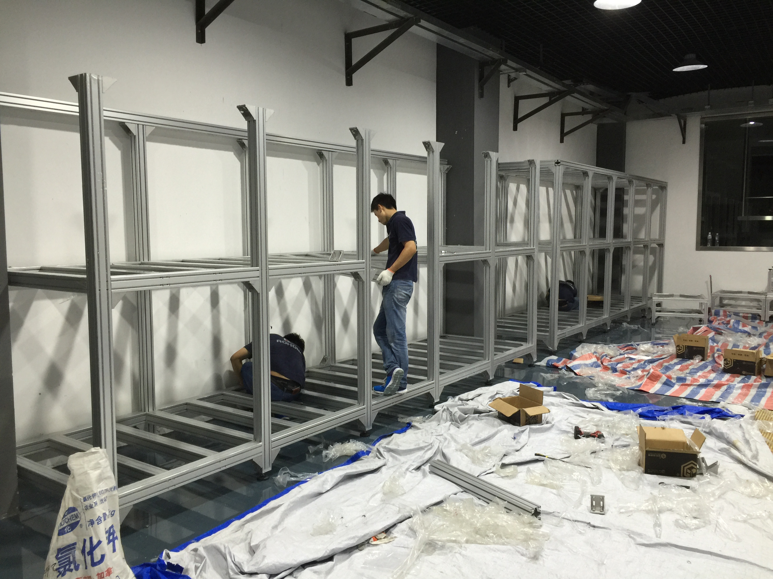 了解朱經理的項目需求后,我們立刻對朱經理項目進行設計,朱經理的項目施工在崇明中華鱘夢園,約有200平方的占面積,每個定制鋁型材框架,高3米,長15米的,承載力要達10噸,我們整個鋁框架的方案全部采用歐標80120鋁型材做立柱,8080鋁型材做橫梁,結構連接采用12.9級高強度不銹鋼螺栓+打孔連接,并外面用直角件加固連接保確承重安全及結構穩定。工藝,是加工好后,現場施工。自方案設計到生產總15天,并在5天內完成上門施工。