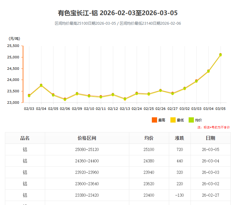 進入2026年3月,國內鋁錠價格迎來新一輪強勢上漲。根據長江有色網最新數據,3月5日鋁錠均價已飆升至25100元/噸,單日漲幅高達720元,創下近階段新高。這一劇烈波動不僅牽動著上游電解鋁企業的神經,更對下游工業鋁型材 加工行業帶來了嚴峻的成本考驗。